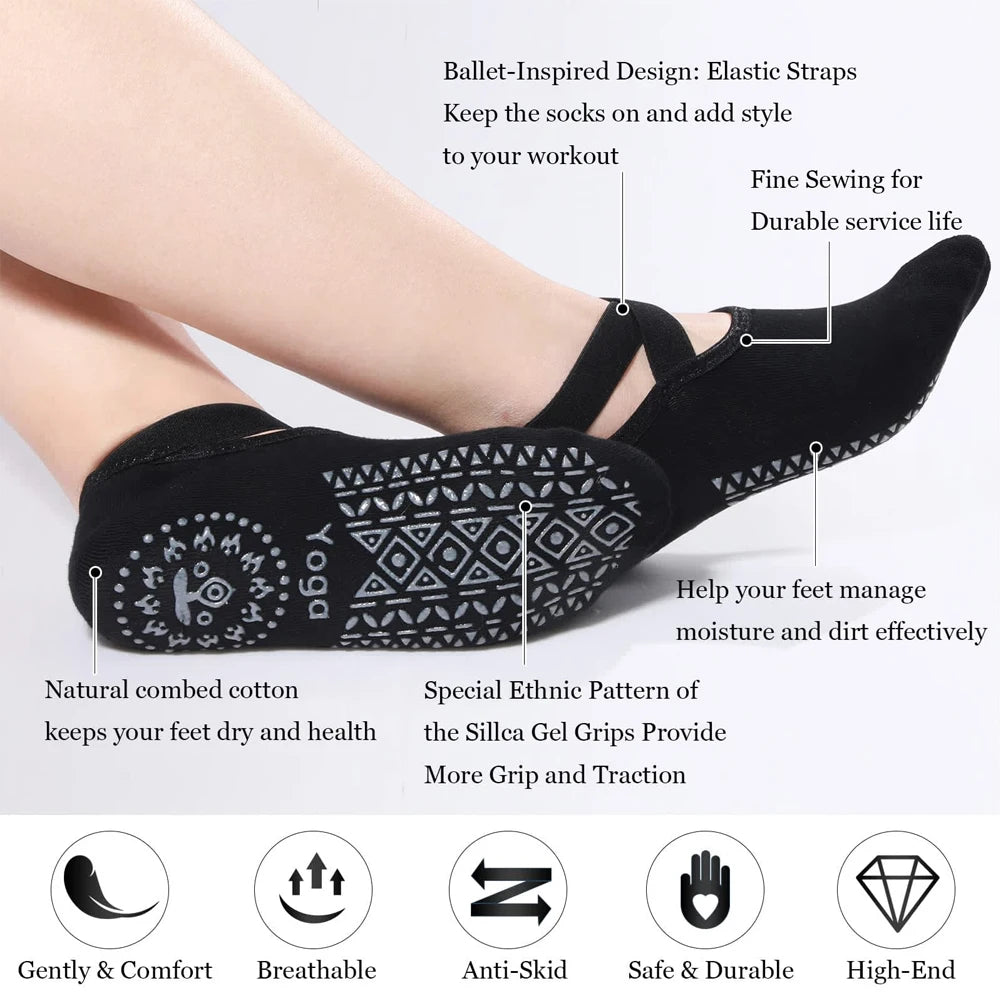 1 Pair Sports Yoga Socks for Women Girls Non-Slip Grips & Straps, Ideal for Pilates, Pure Barre, Ballet, Dance, Barefoot Workout