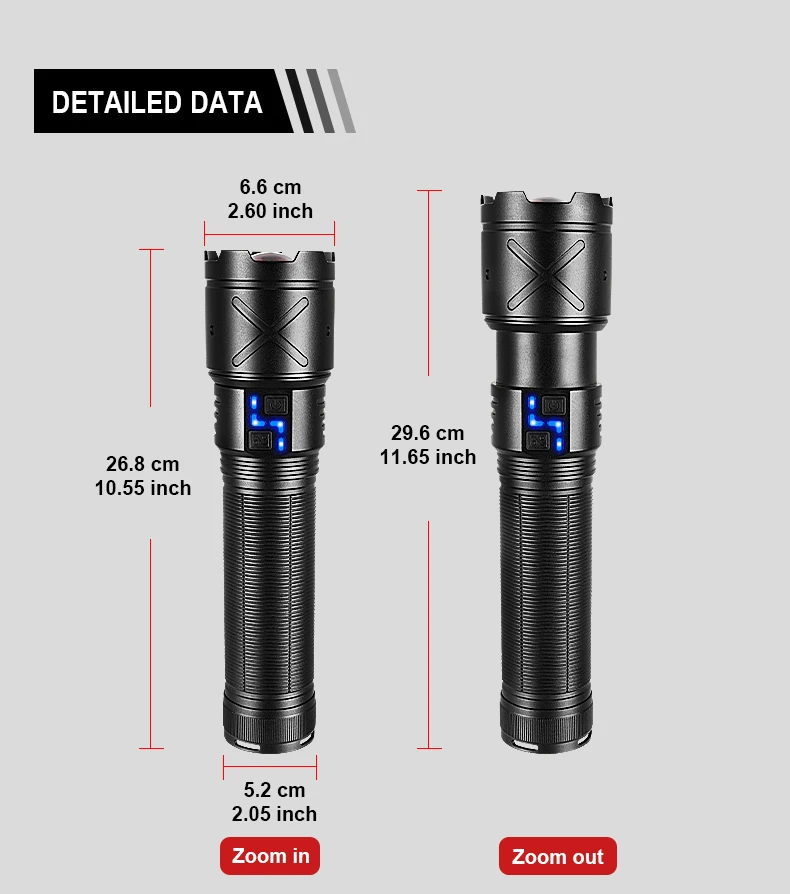Note: The flashlight weighs 830g. It is heavy in weight and large in size. It is recommended for people with excellent physical fitness.