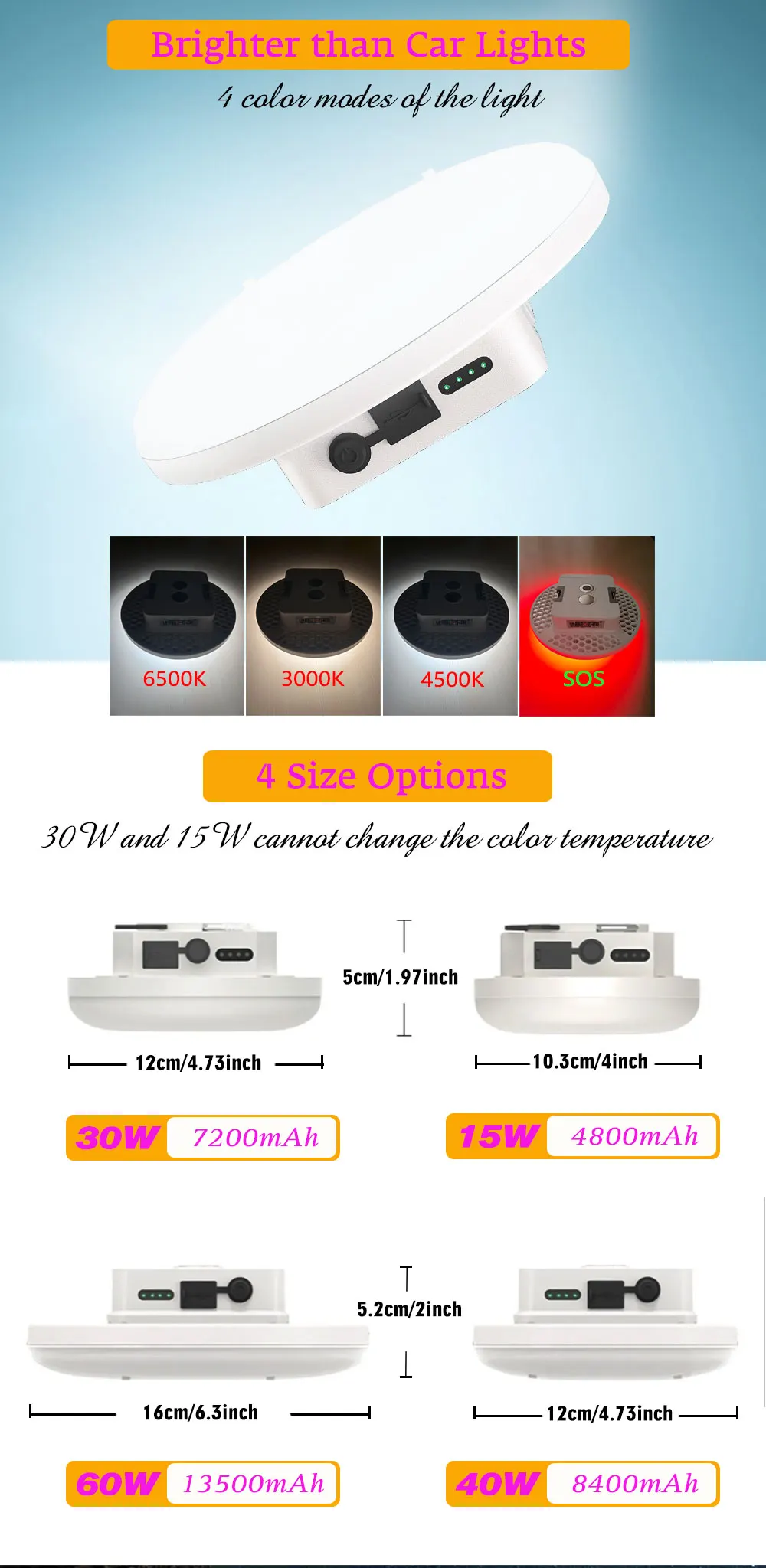 2, 4 light Modes: white light, neutral light, warm light,SOS (40W and 60W)