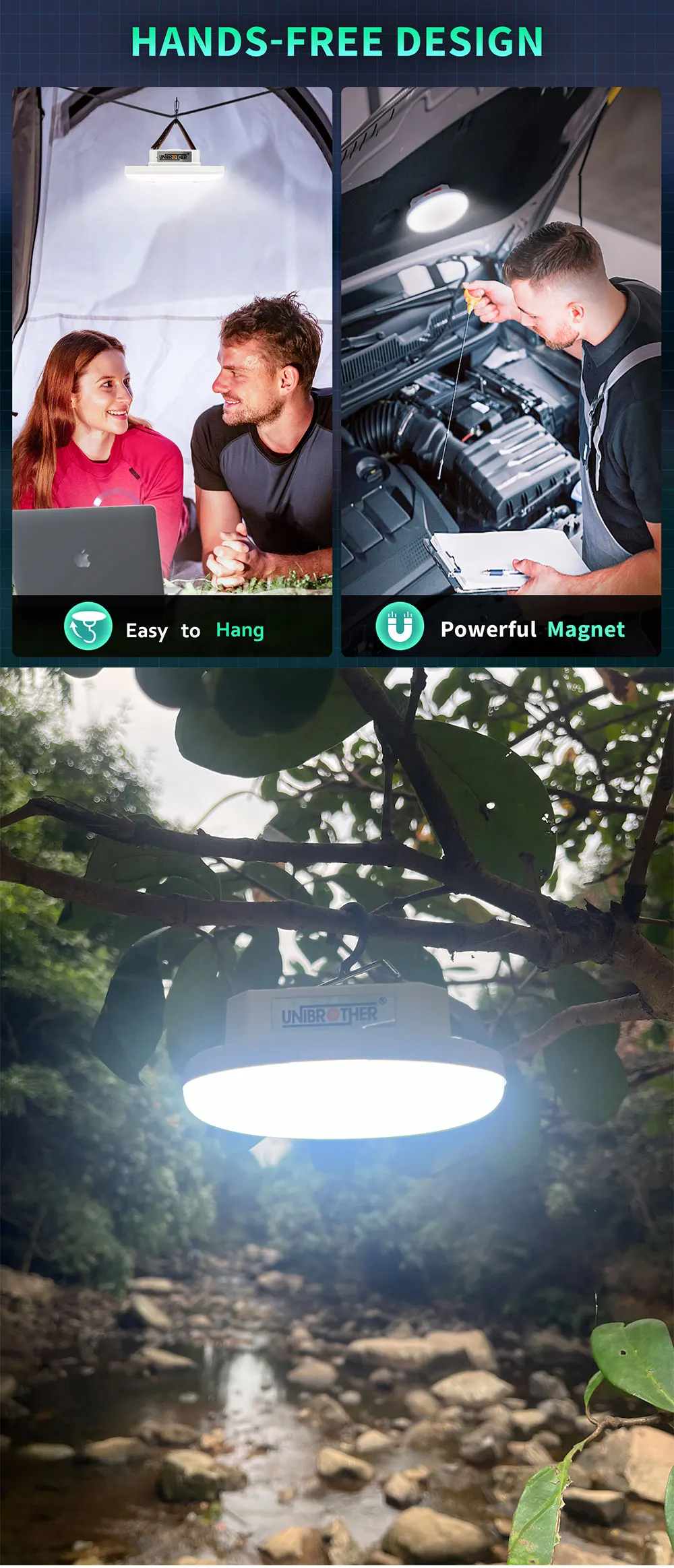 A5:Unibrother camping lantern has a technology that no other seller can do. Most camping lights hit 2000 lumens and basically have spotting, Unibrother camping light hits 2000 lumens but the light is still pretty even. So Unibrother camping lights not only have really strong lights, but the lights also work really well.