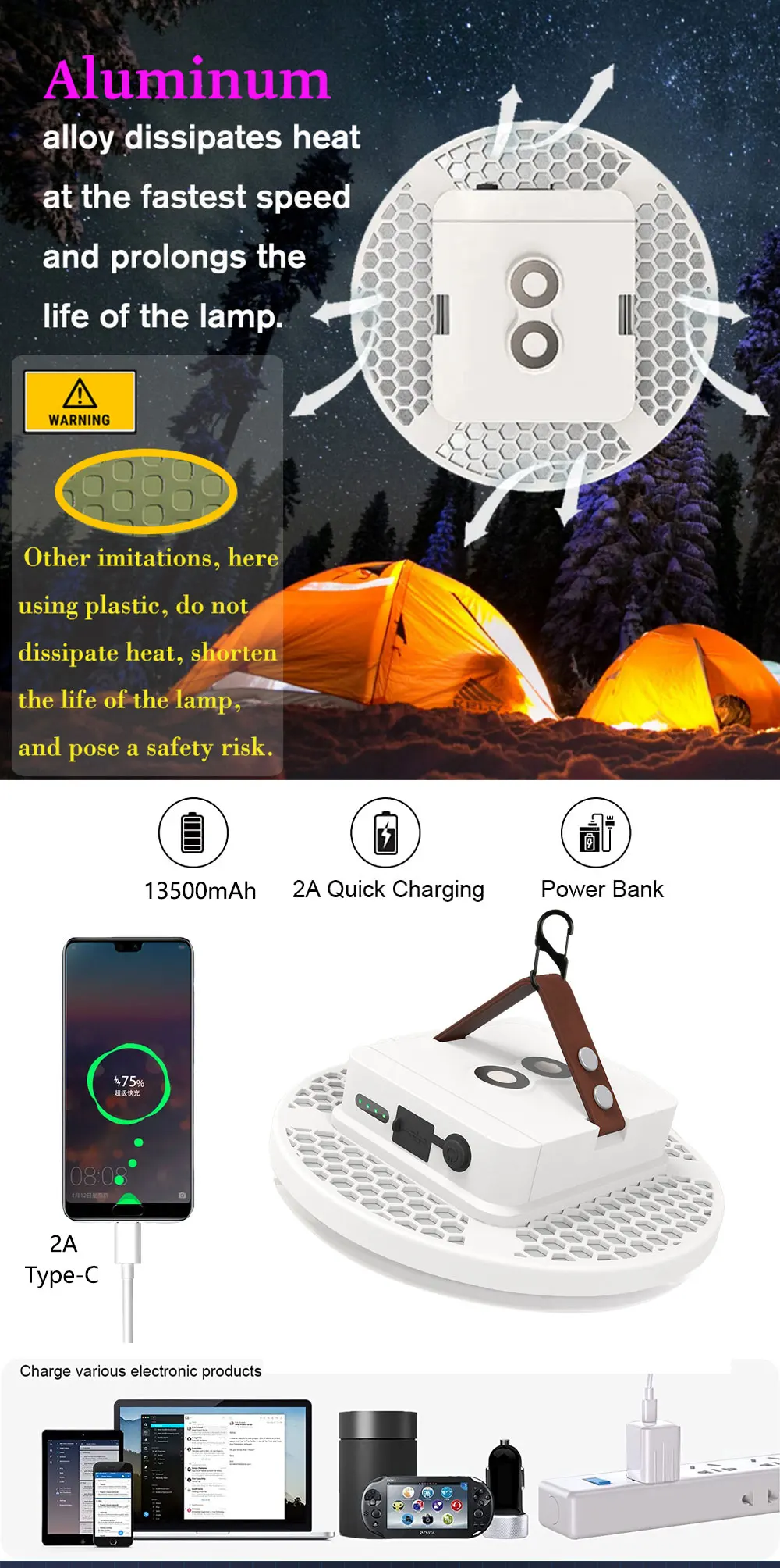 1, Strong Light: The maximum lumen value of camping lights-2000LM.