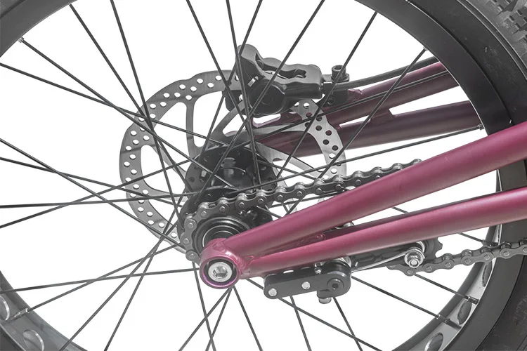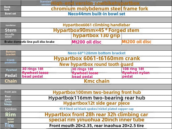 Front wheels: 20-inch 35mm wide front rim with Kenda 20 × 2.3 front tire. Rear wheels: 19-inch 47mm rear rim with Inova 20 × 2.5 climbing rear tire. Visually, the rear rim is almost twice as wide as the front rim, and the rear tire is almost twice as thick as the front tire. These are the most obvious appearance characteristics of a professional climbing car, and the most direct characteristics to determine whether an entry-level model is professional.