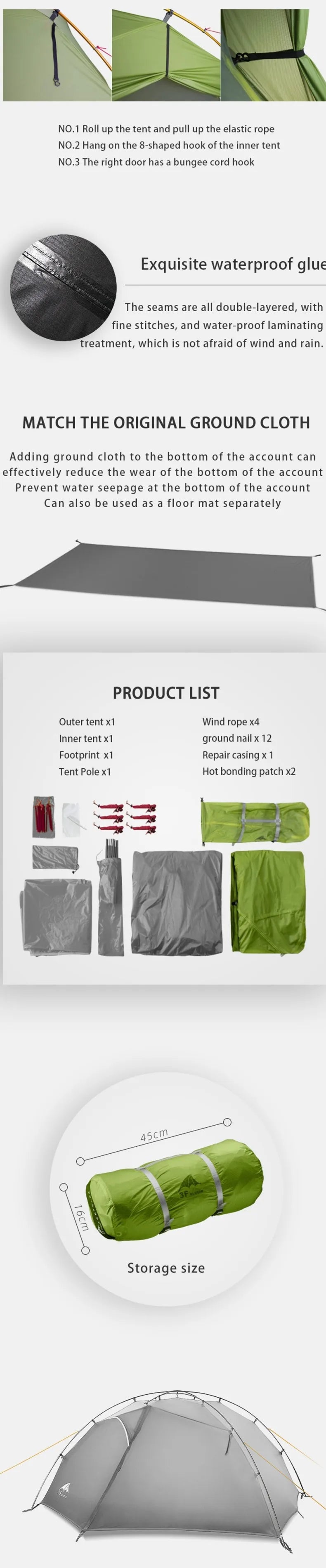 [Packing list]:Outer tent*1,Inner tent*1,Pole*1,Footprint*1,Wind rope*4,Groung nail*12,Repair casing*1,Hot bonding patch*2