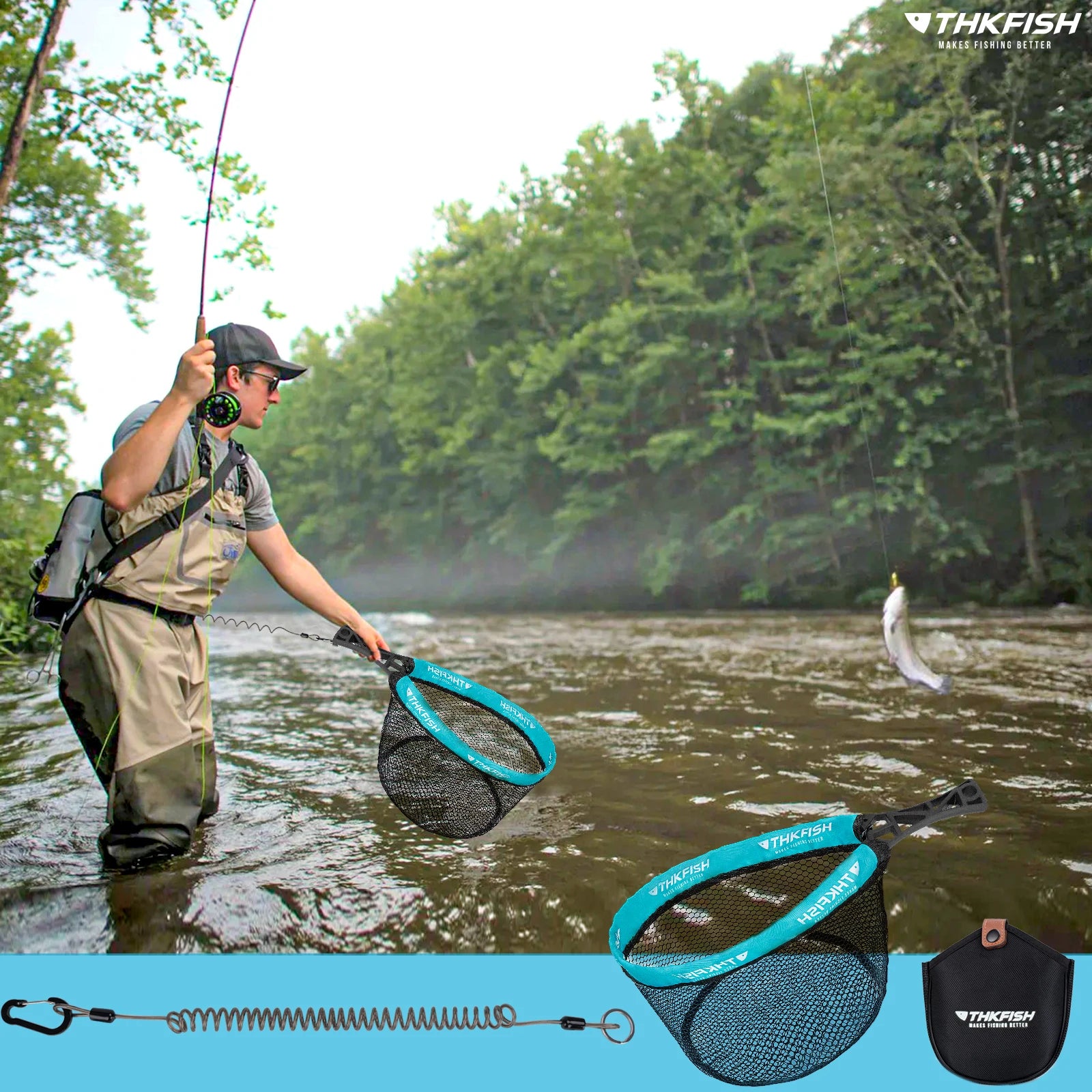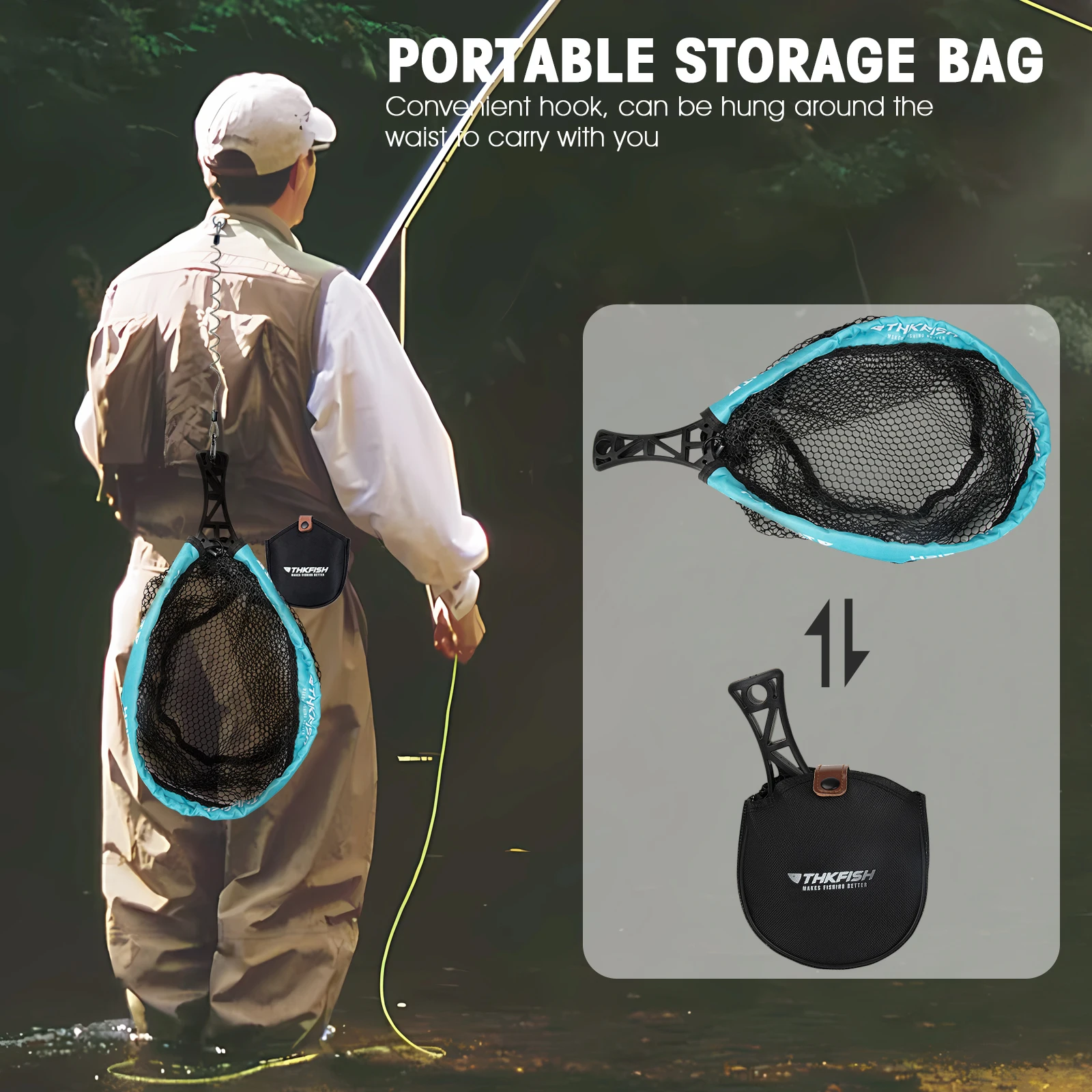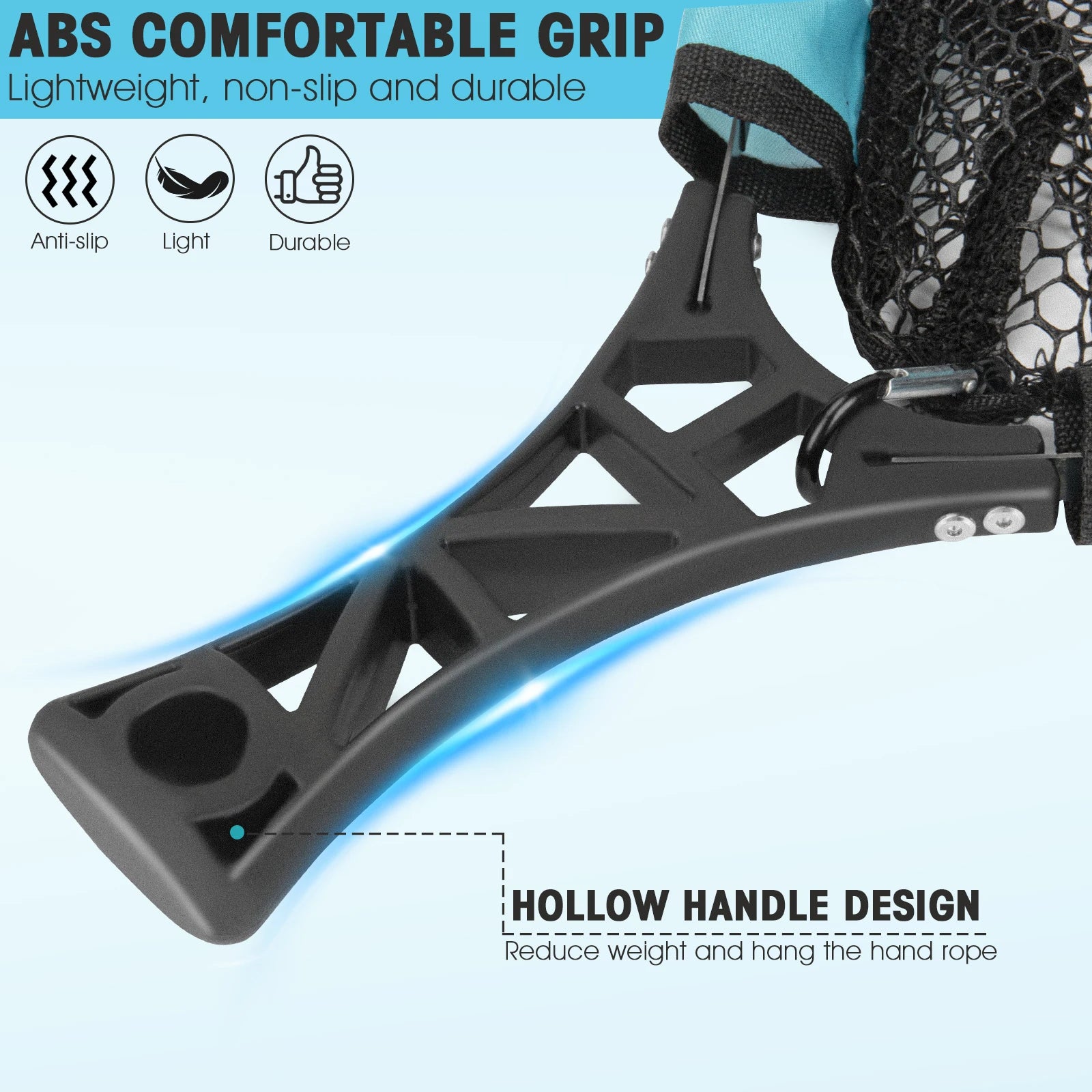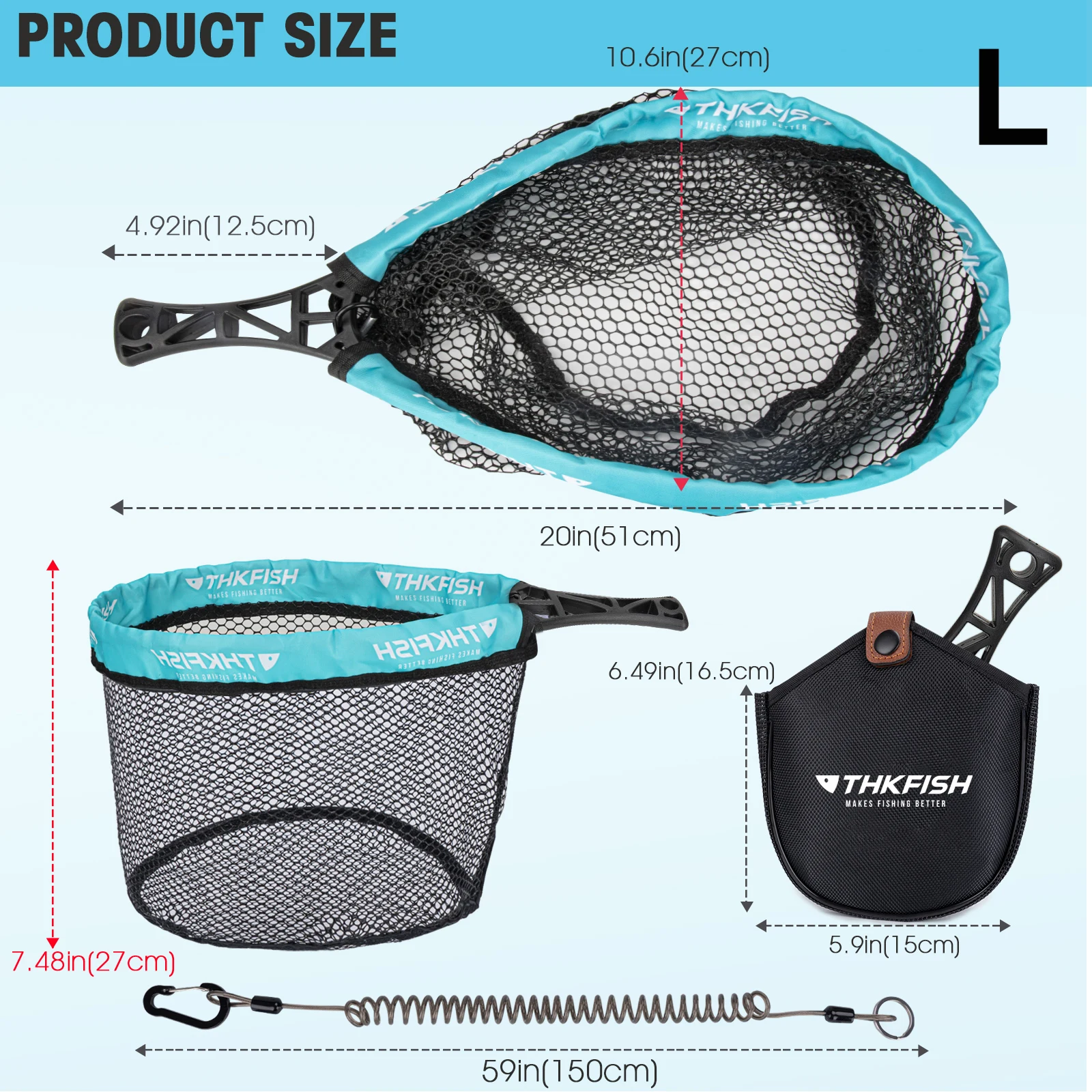 Material: ABS ,Metal, rubber meshHandle Material: ABSSize: M: 9.44in*17.9in(24cm*45.5cm), L: 10.6in*20in (27cm*51cm)Package includes:1pcs* fly fishing net1pcs * storage bag1pcs * Spring hook