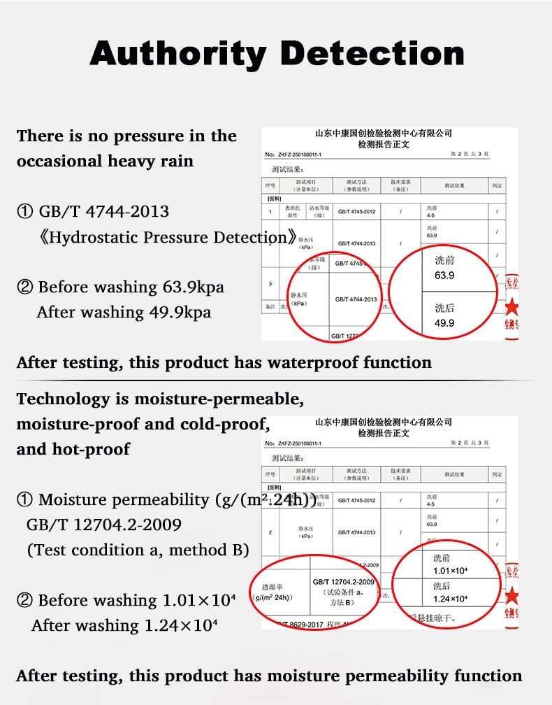1. Fabric: 100% polyester fiber. 2. Waterproof Fabric: After being tested by professional institutions, Hydrostatic Pressure: 63.9kpa before washing, 49.9kpa after washing, It has good water resistance and can resist moderate rain and snow, You'll stay dry with this water-repellent jacket. With its snug fit, hood, cinched-in sleeve ends and full-length zip, this waterproof will keep your other clothes and your skin from getting damp while you're out and about. 3. Breathable: After testing by professional institutions, Moisture Permeability: 1.01×10⁴ before washing, 1.24×10⁴ after washing, with moisture permeability function, Good breathability can avoid moisture caused by sweat. 4. Durable, Breathable Polyester Fabric: Moisture-Wicking fabric keeps you warm and comfortable. 5. Scratch Resistant: The fabric is resistant to abrasion and is not afraid of scratching, allowing your outdoor adventures to be free and comfortable. 6. Season: Autumn & Spring. 7. Gender: Unisex. 8. Occasion: The Jacket are great for jogging, running, hiking, traveling, climbing, camping, skiing, walking, exercises, traveling or lounge and daily wear.