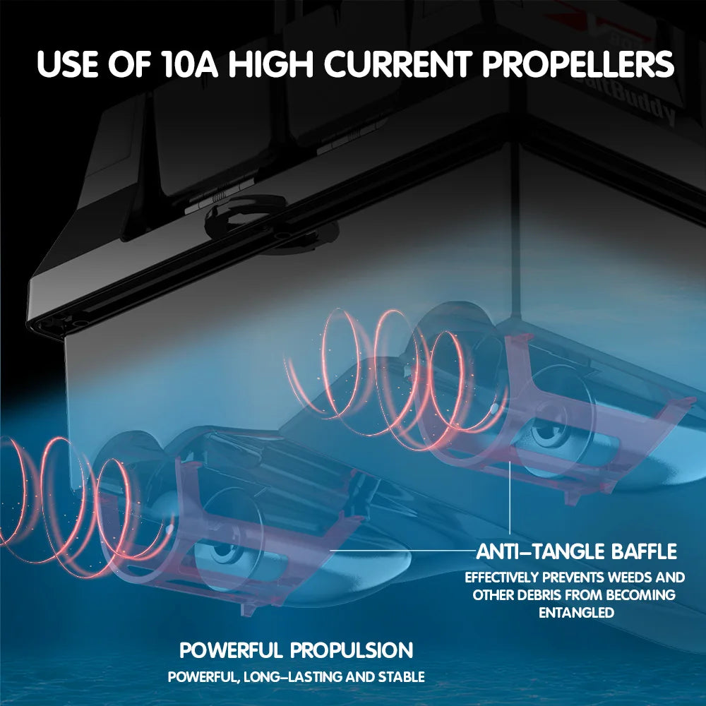 With forward, reverse, and left/right turn capabilities, plus cruise control for consistent speed, navigating your favorite fishing spots has never been easier. Dual high-gain antennas deliver an ultra-stable signal with a control range of up to 500 meters, while the dual power input design supports uninterrupted operation using two batteries.