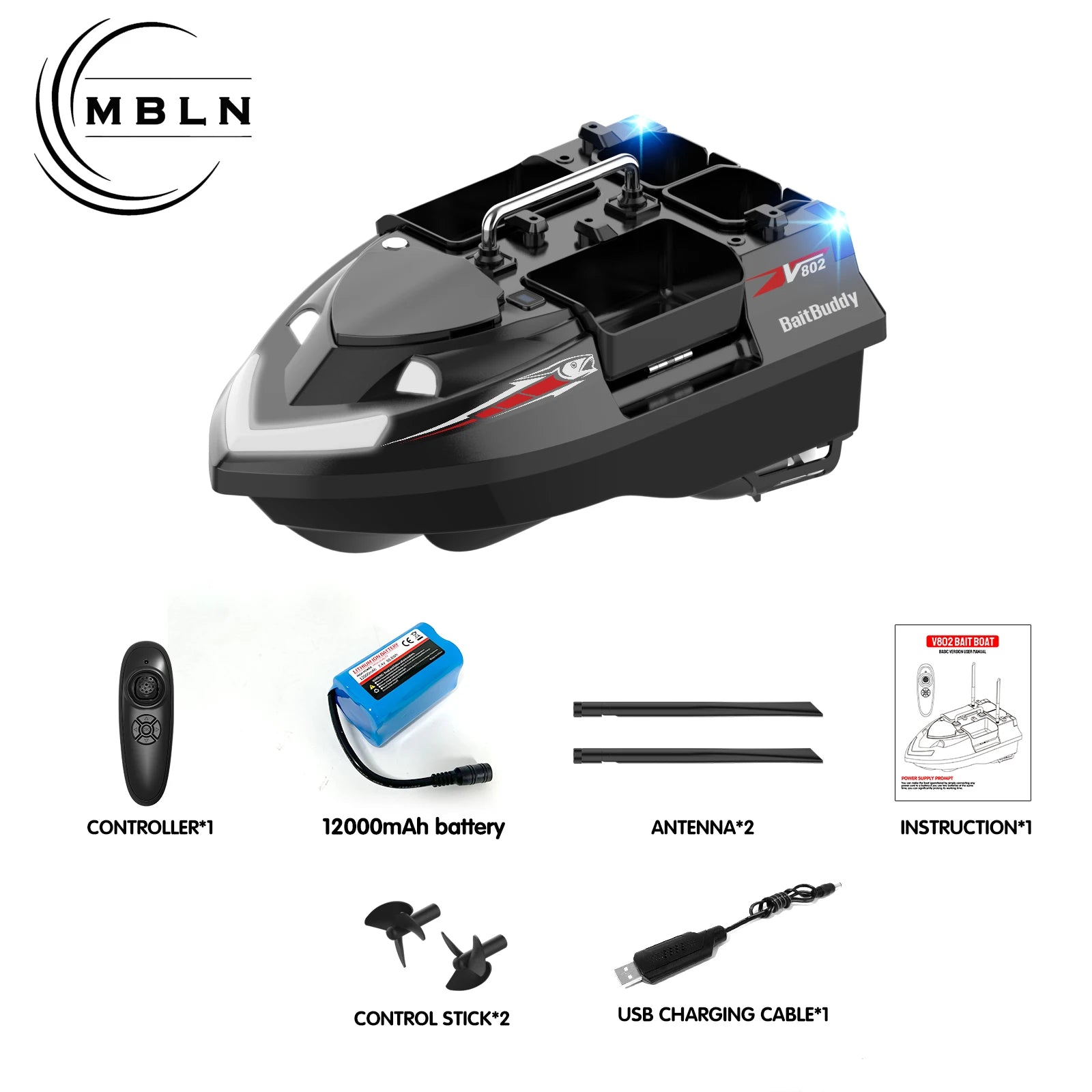 MBLN Bait Boat with 4 Independent Hoppers,Dual Antennas for 500m Range, Dual Power Supply, Front & Rear Lights for Night Fishing